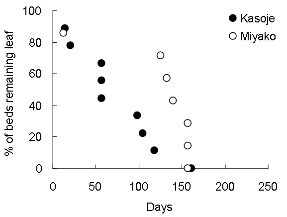 Figure 2. Rate of decay of chimpanzee beds in period 1. *: Three beds were remained undecayed. During Period 2, we monitored 38 chimpanzee beds in Kasoje. We set a 100 day limit for monitoring these beds and more than half of the beds (22/38) were decayed by the end of this period (Figure 3). This was not statistically different from the decay rate for Period 1 beds in Kasoje over 100 days (6/9; Fisher’s exact test, p = 0.72), but was significantly greater than the decay rate for beds in Miyako (1/7; Fisher’s exact test p < 0.05).
