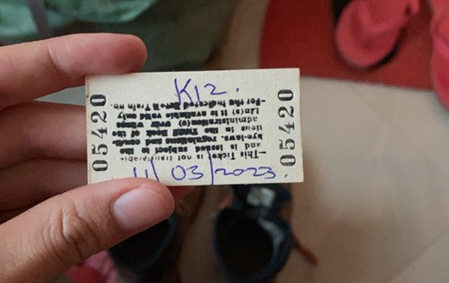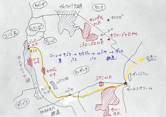 図1 私が家族に送った帰国経路図。地図下方、ムベヤとダルエスサラームをつなぐ点線がTAZARA乗車区間。 3月10日。夕方バスでムベヤに到着し、まずは今夜の宿探しから。TAZARAは明日の15時発の予定です。バスターミナルでバジャジ(原付三輪タクシー)に乗って運転手の兄ちゃんおすすめの駅前のホテルへ連れて行ってもらいました。「明日TAZARAに乗るんだ」と言うと、わざわざ駅の前を通って「駅はここだからな!」と親切に駅を見せてくれました。宿探し、無事クリア!今日はもうホテルで晩御飯を食べてゆっくり休みます。 3月11日。この日の最初にして最大のミッションはTAZARAのチケットを手に入れること。なんとしても4人部屋ベッド付きの一等席を取らねばなりません。予定では1泊2日の鉄道旅、ベッドなしはツラいです。もし売り切れてたらどうしよう…。ホテルの人曰く、駅の窓口は9時くらいから開くとのことなので、ホテルで朝食にチャパティとバナナを食べてから9時に駅へ。駅舎内はガラガラですが、窓口には10人ほど人が。何やら前に並んでいる白人二人がもめています。もしや一等席売り切れか…? 自分の番になり、恐る恐る「一等席のチケットください…」と言うと、「1人?」とすぐにチケットを売ってくれました(写真1)。よかった!しかし、無事チケットをゲットして安堵したのもつかの間、衝撃の一言が。