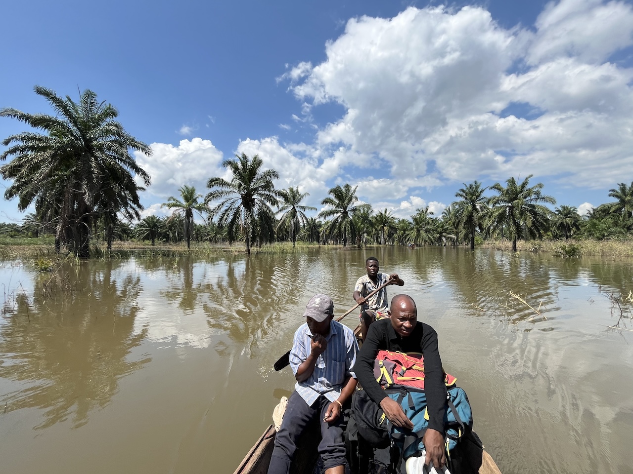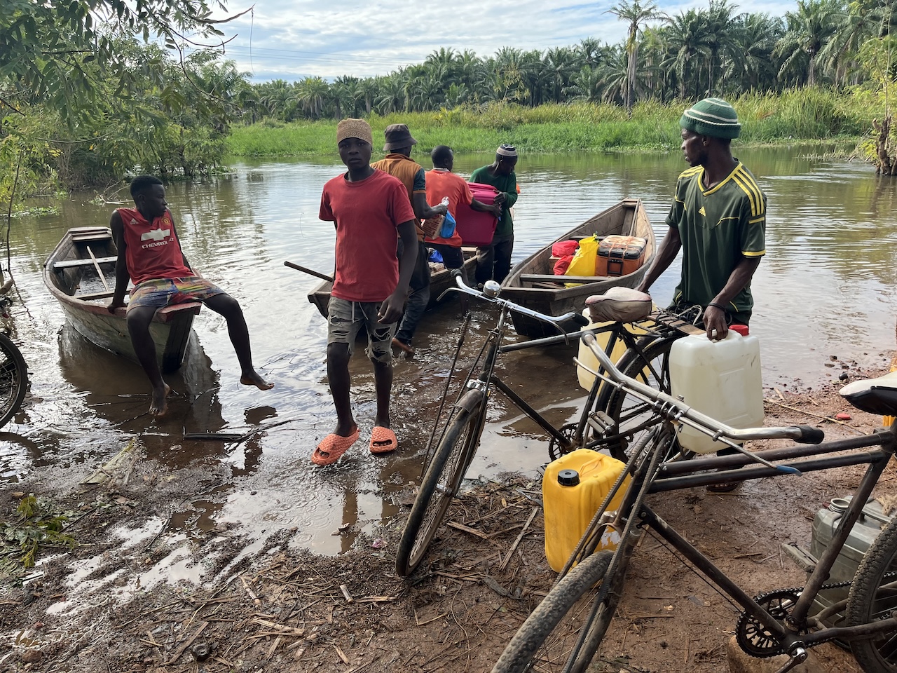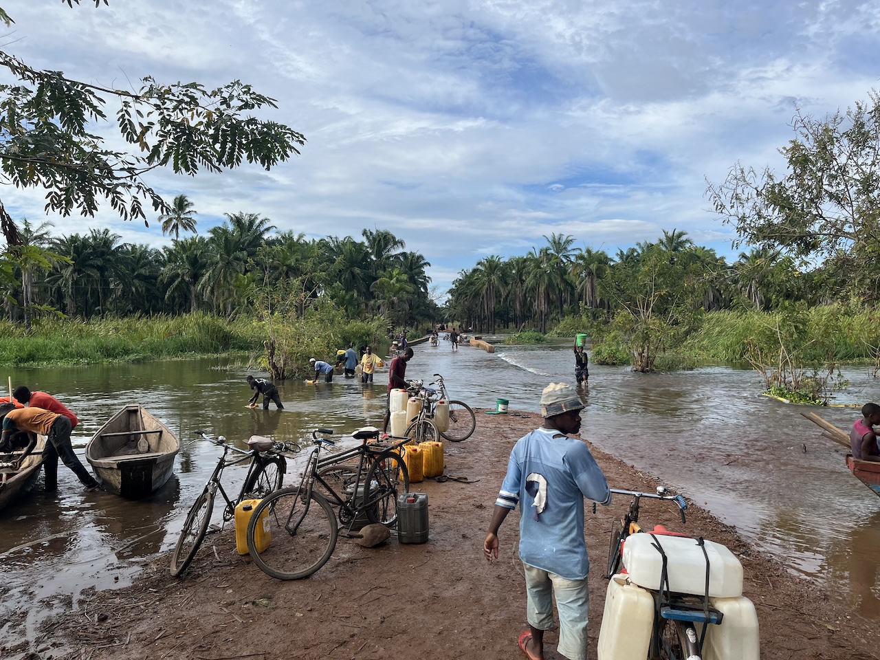 写真3 道を飲み込むマラガラシ川 「ちはやぶる神代も聞かずマラガラシ」 ふとそんな句が頭をよぎりました。 当然ながら、水陸両用でもないふつうのタクシーでこれ以上進むことはできません。ここからの移動は手漕ぎの渡し船になりました(写真4)。たくましいことに、既に何隻も渡し船が往復していて、新しい社会インフラとして機能している感がありました。船頭さんに500 シリング(約30 円)を払って、ゆっくりと水浸しの世界を進んでいきます(写真5)。私は、スタジオジブリ制作の映画「崖の上のポニョ」のワンシーンを思い出していました。主人公のそうすけとポニョが魔法で大きくしたおもちゃの蒸気船に乗って洪水後の世界をトコトコと進んでいく場面を思い出していました。電信柱もアブラヤシの木も、川の中から生えているように見えます。人力でゆったりと進むボートに座って静かな風を浴びていると、世界の移り変わりを肌で感じられるようでした。