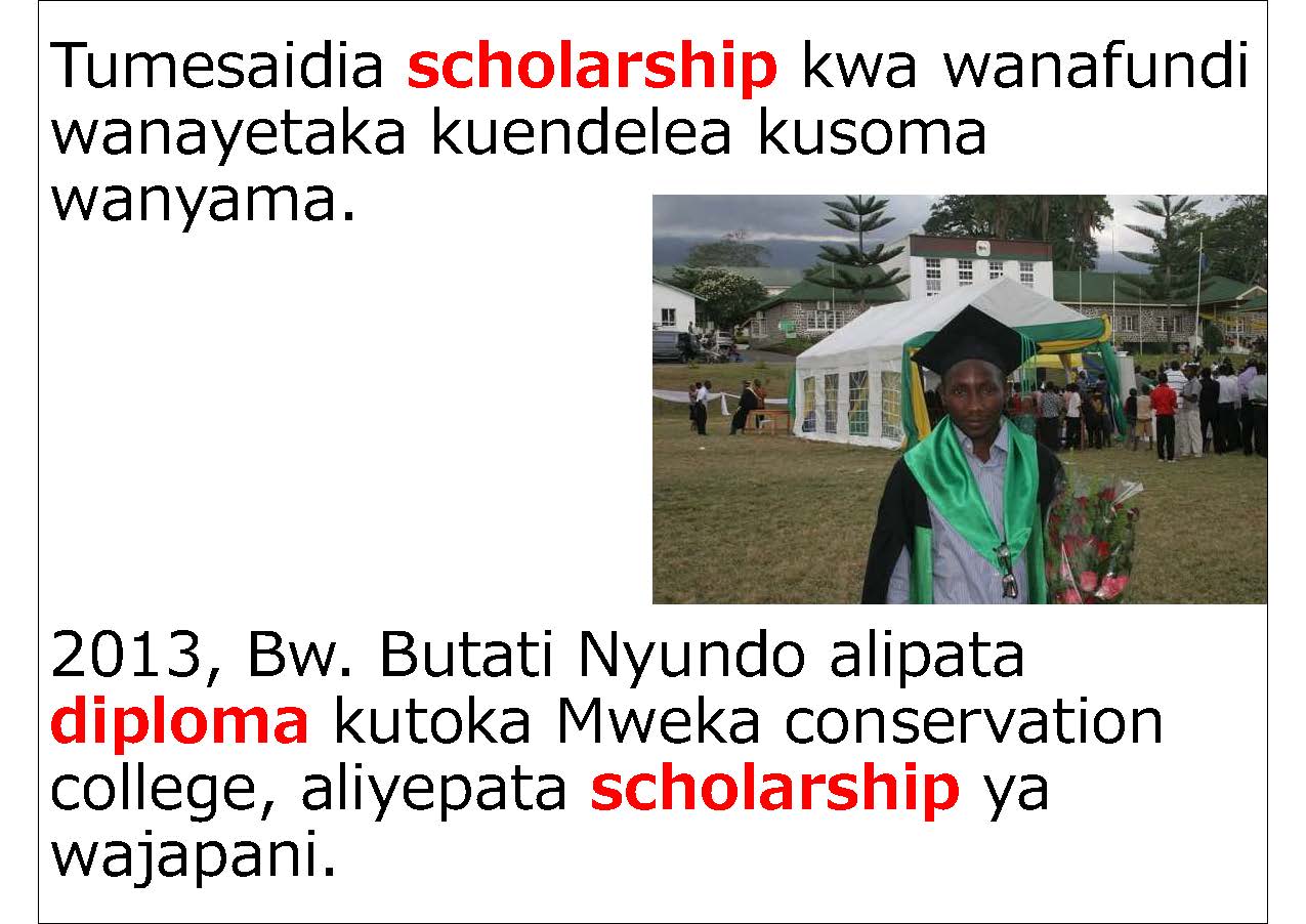 図1 授業の際に用いたスライドの一部。これまでにMWCS がブタティ・ニュンドー氏に対して奨学金を給付し、その結果、ムウェカ・アフリカ野生生物管理カレッジからディプロマを授与された、ということをアピール。 (しまだ まさき・帝京科学大学) 第42号目次に戻る | 次の記事へ |