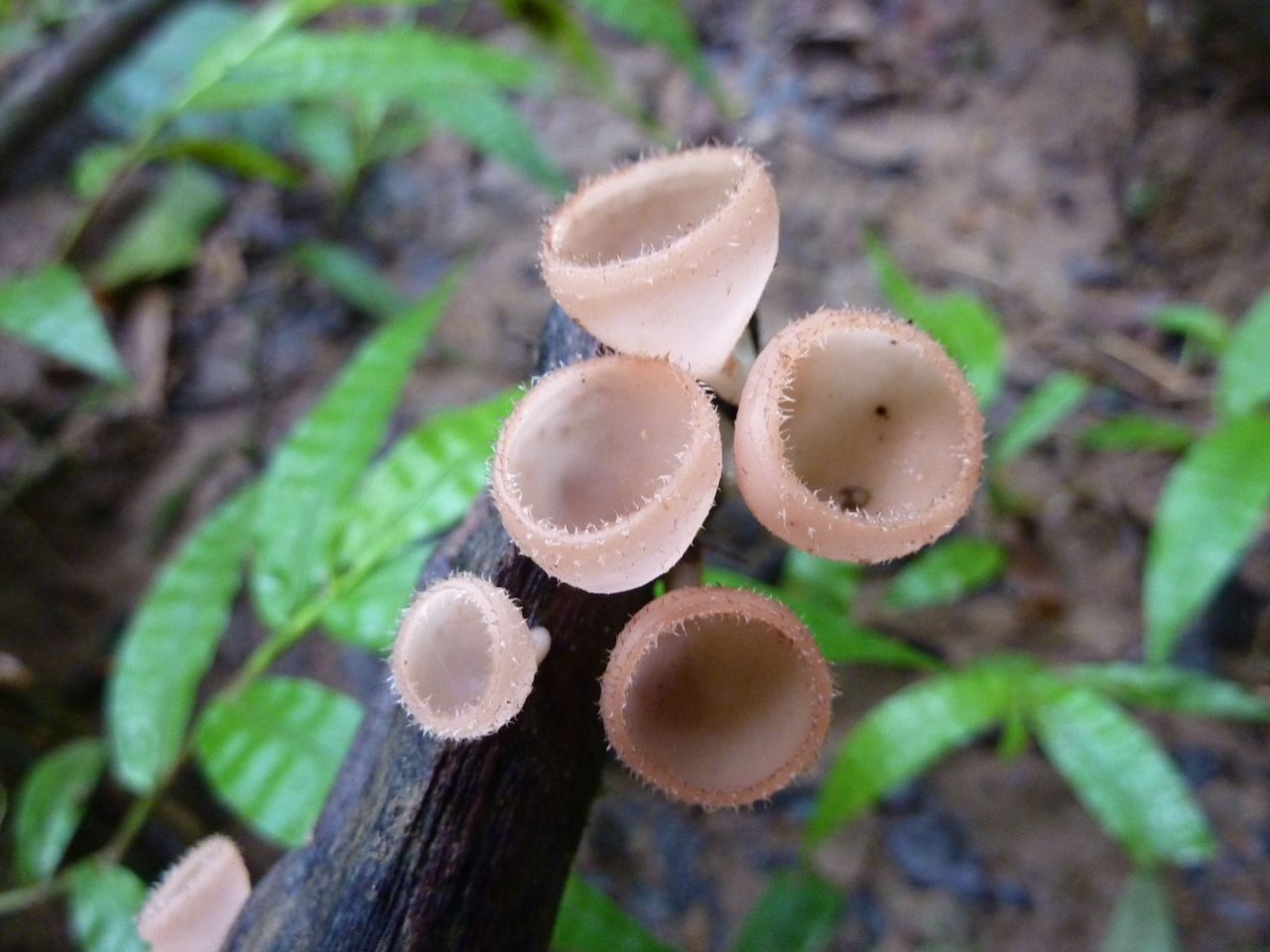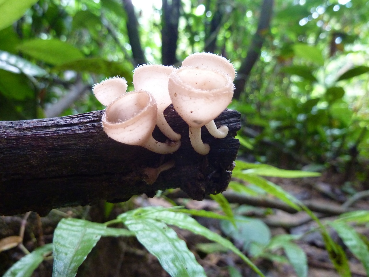 写真2 倒木から生え、比較的長い柄がある。 見比べていくうちに、ベニチャワンタケ科の中のアラゲウスベニコップタケ属(Cookeina)が比較的近いような気がしてきました。ただ、熱帯地方に生息するキノコということらしく、日本語ではあまり情報がありません。 とりあえずの結論。かなり広い意味では「チャワンタケの仲間」、もう少し絞るとおそらく「ベニチャワンタケの仲間」。その先はもはや自信がありませんが、「ウスベニコップタケの仲間」かな? (なかむら みちお・京都大学) 参考文献・サイト